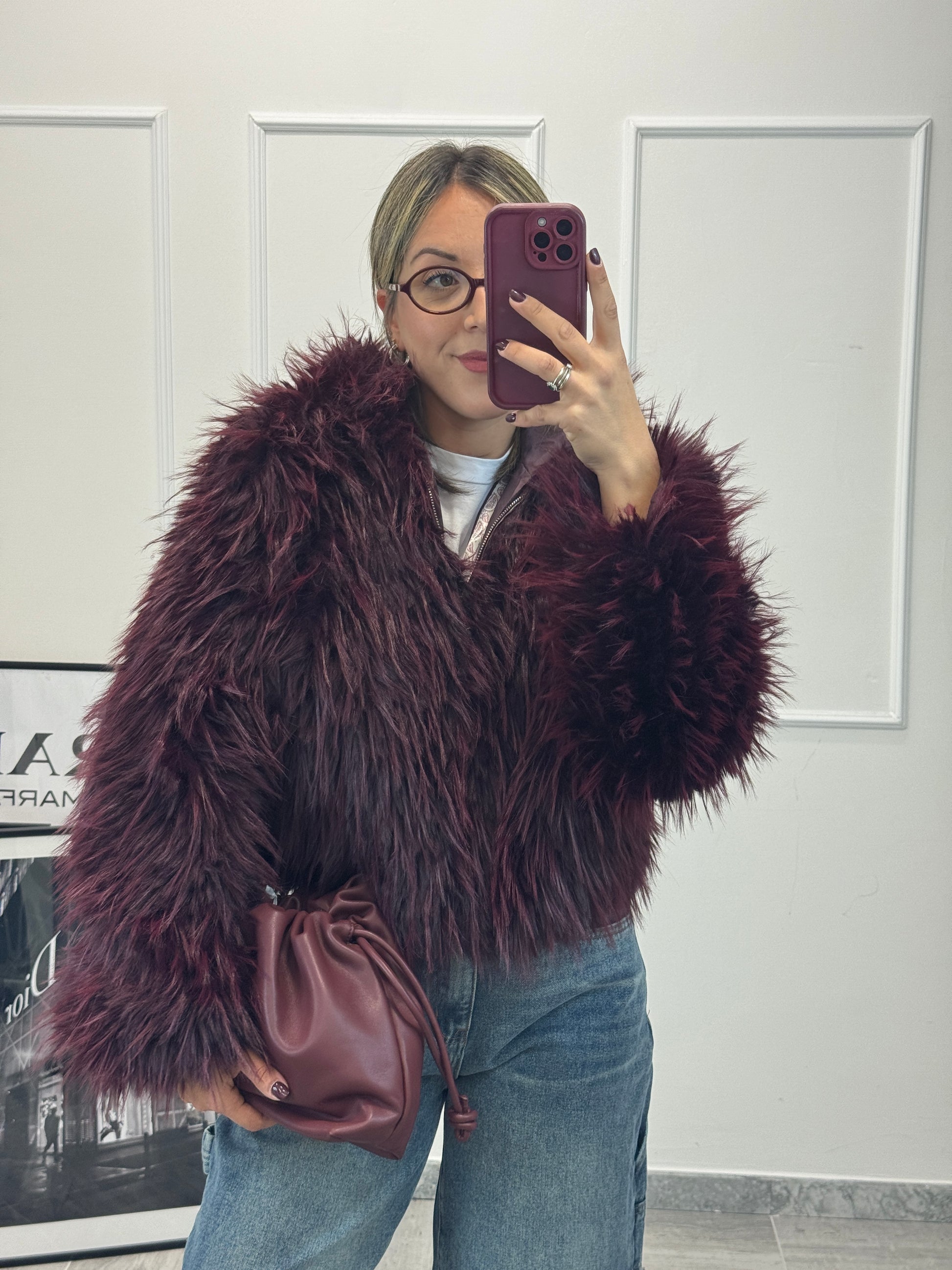 Ecopelliccia con cappuccio. Pelo voluminoso e tasche. La differenza tra le due taglie è impercettibile