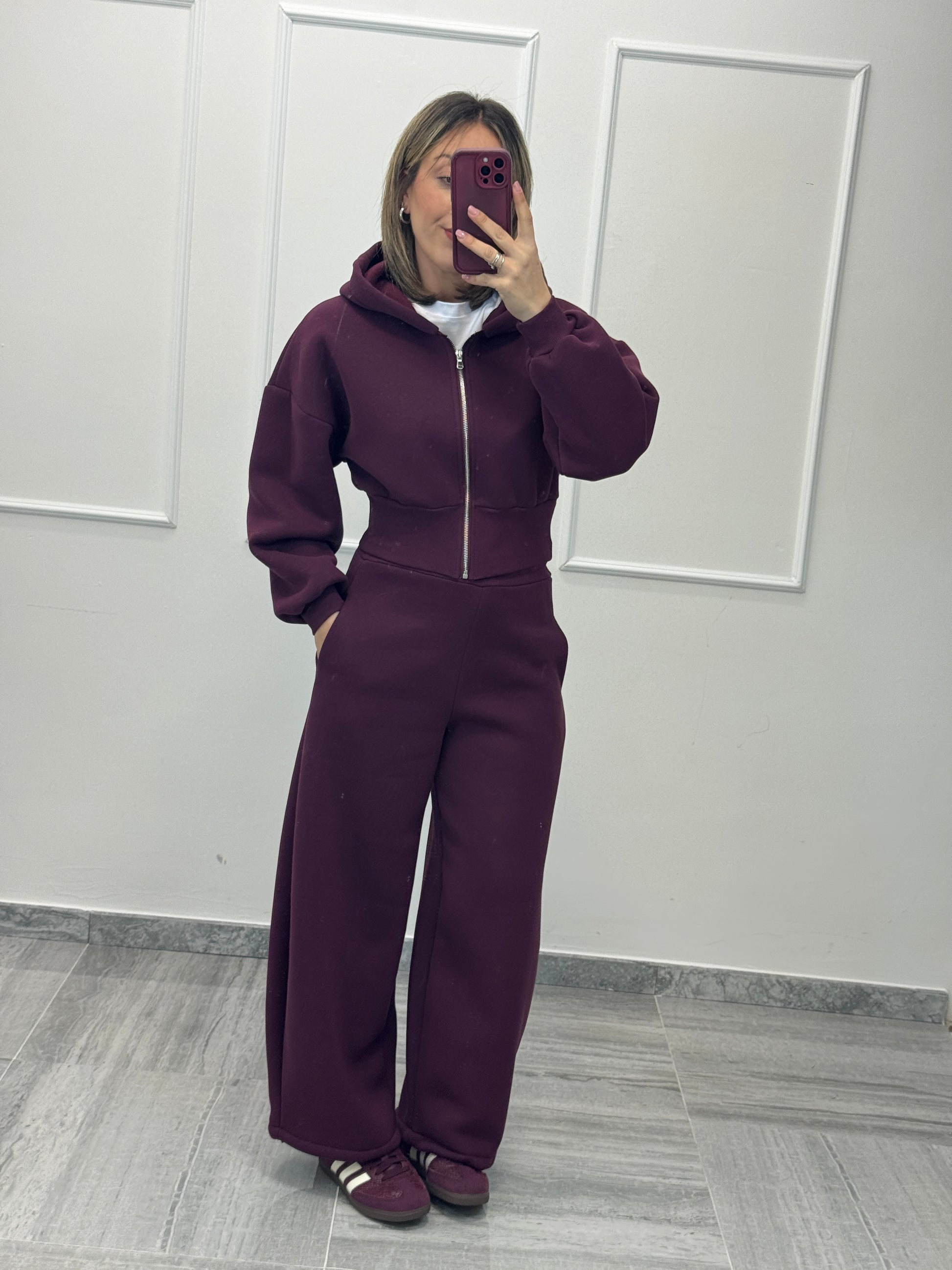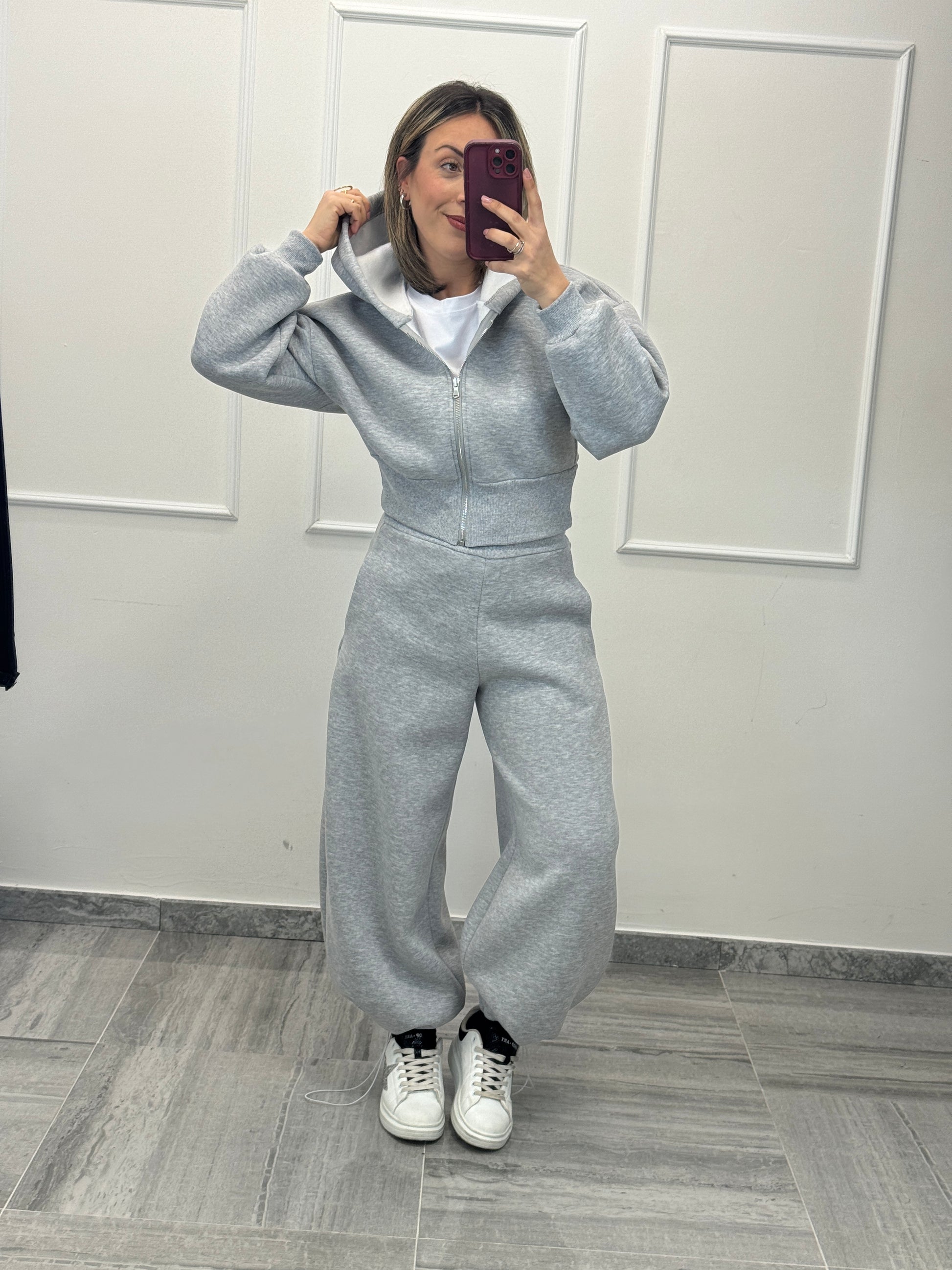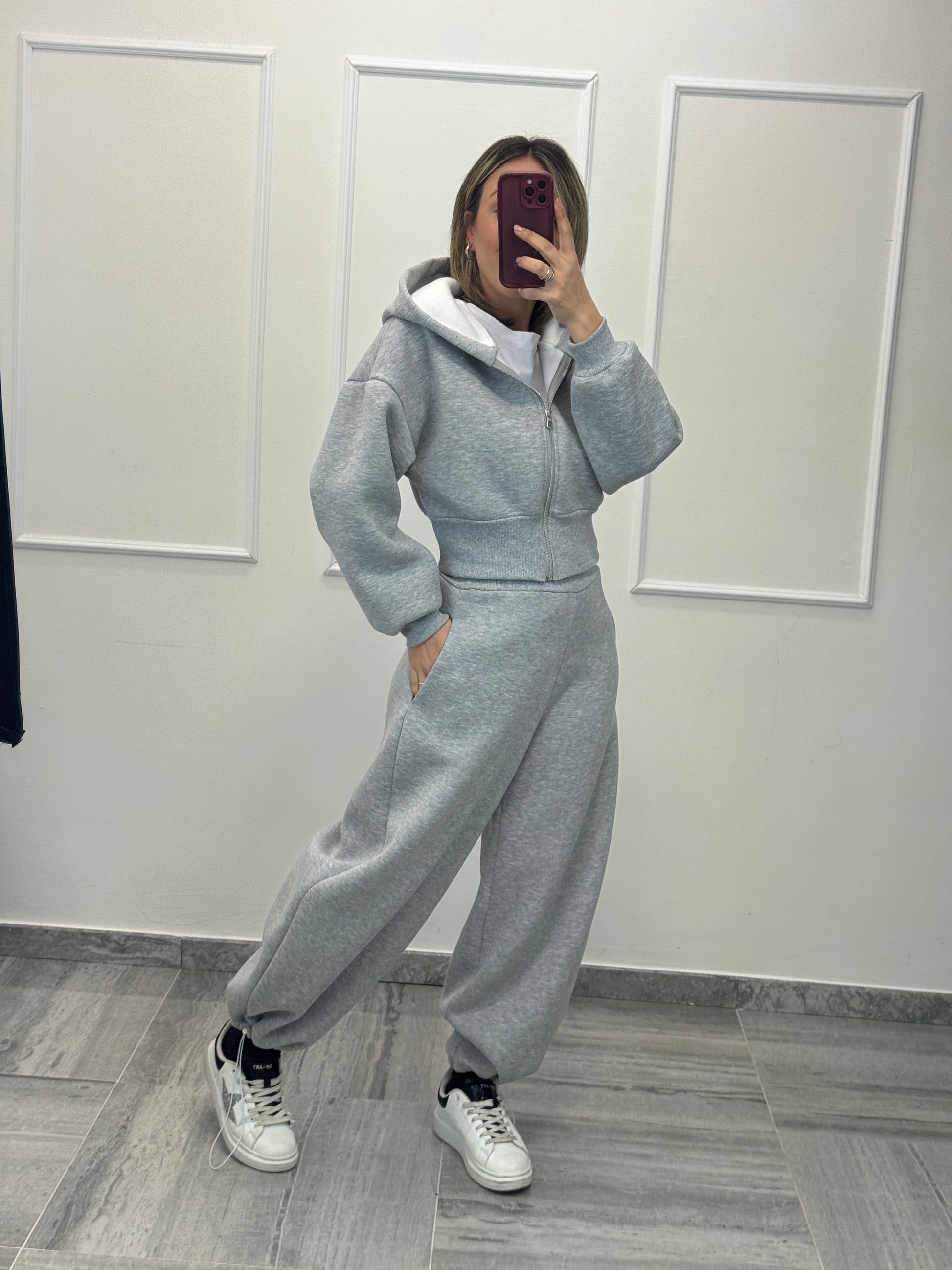 Tuta felpatissima composta da felpa con cappuccio e zip. Pantalone ballon con coulisse regolabile sotto