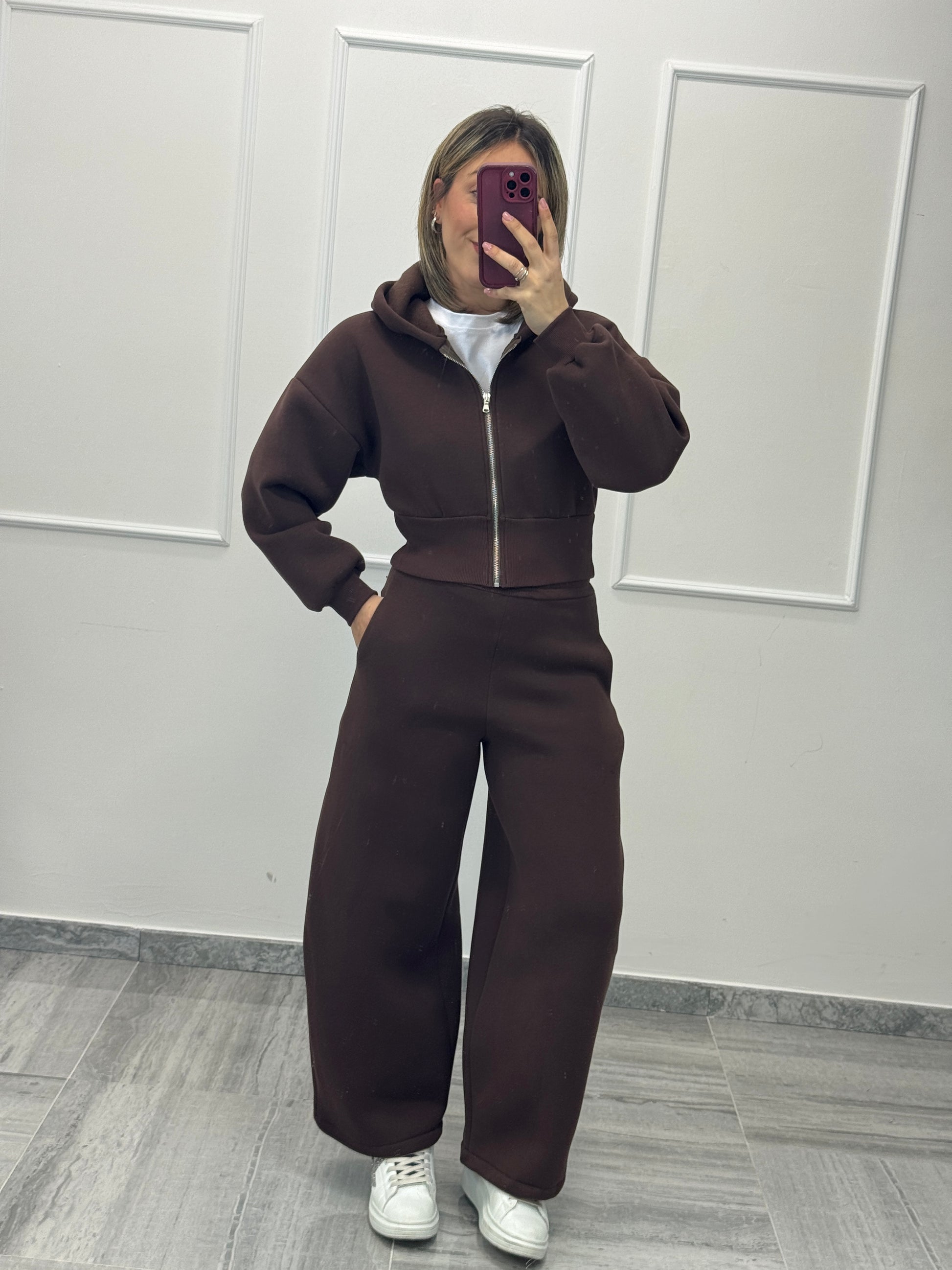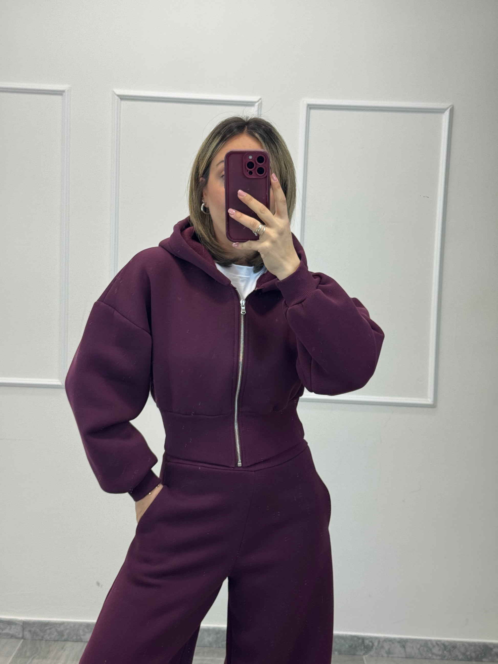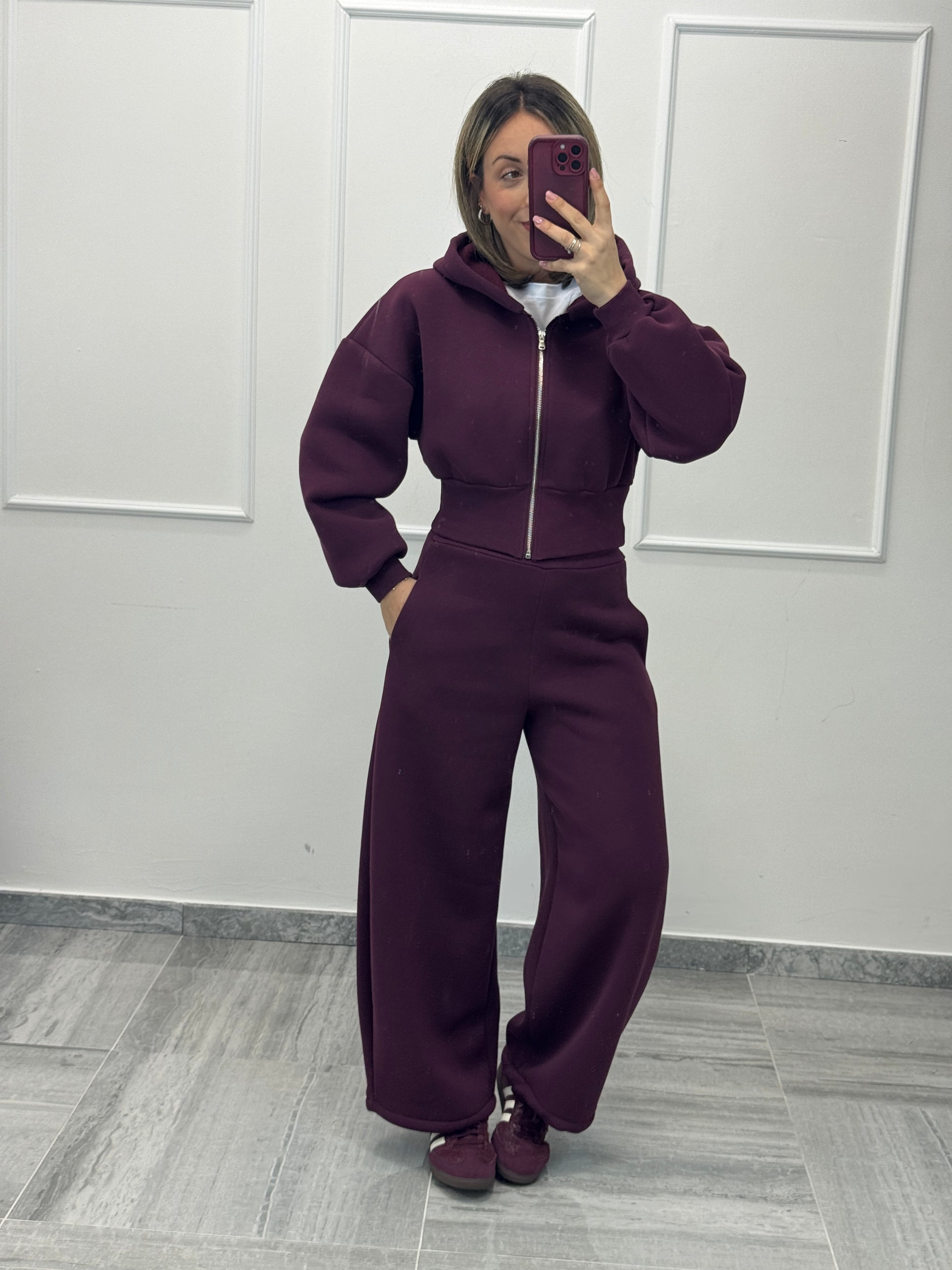 Tuta felpatissima composta da felpa con cappuccio e zip. Pantalone ballon con coulisse regolabile sotto