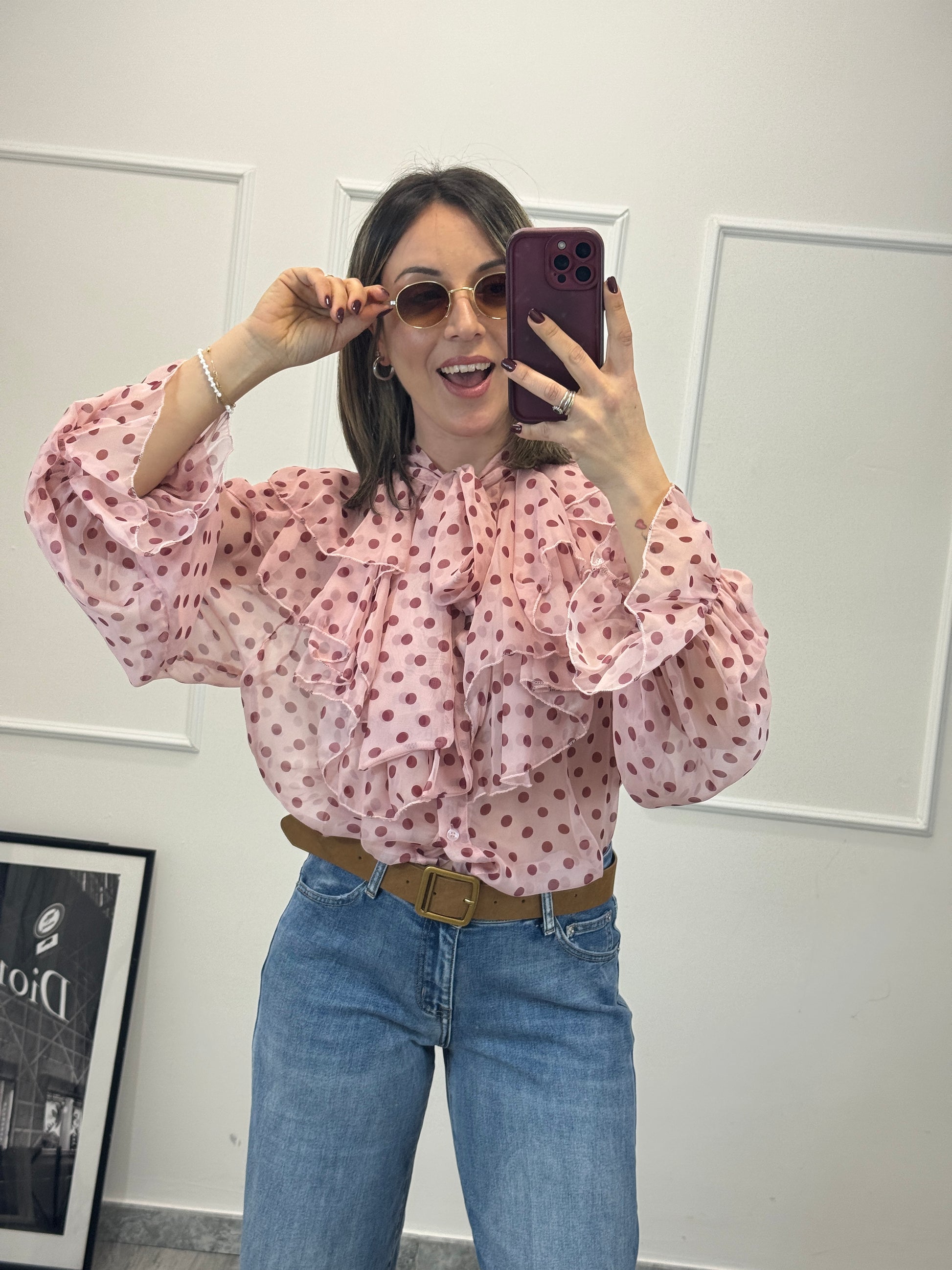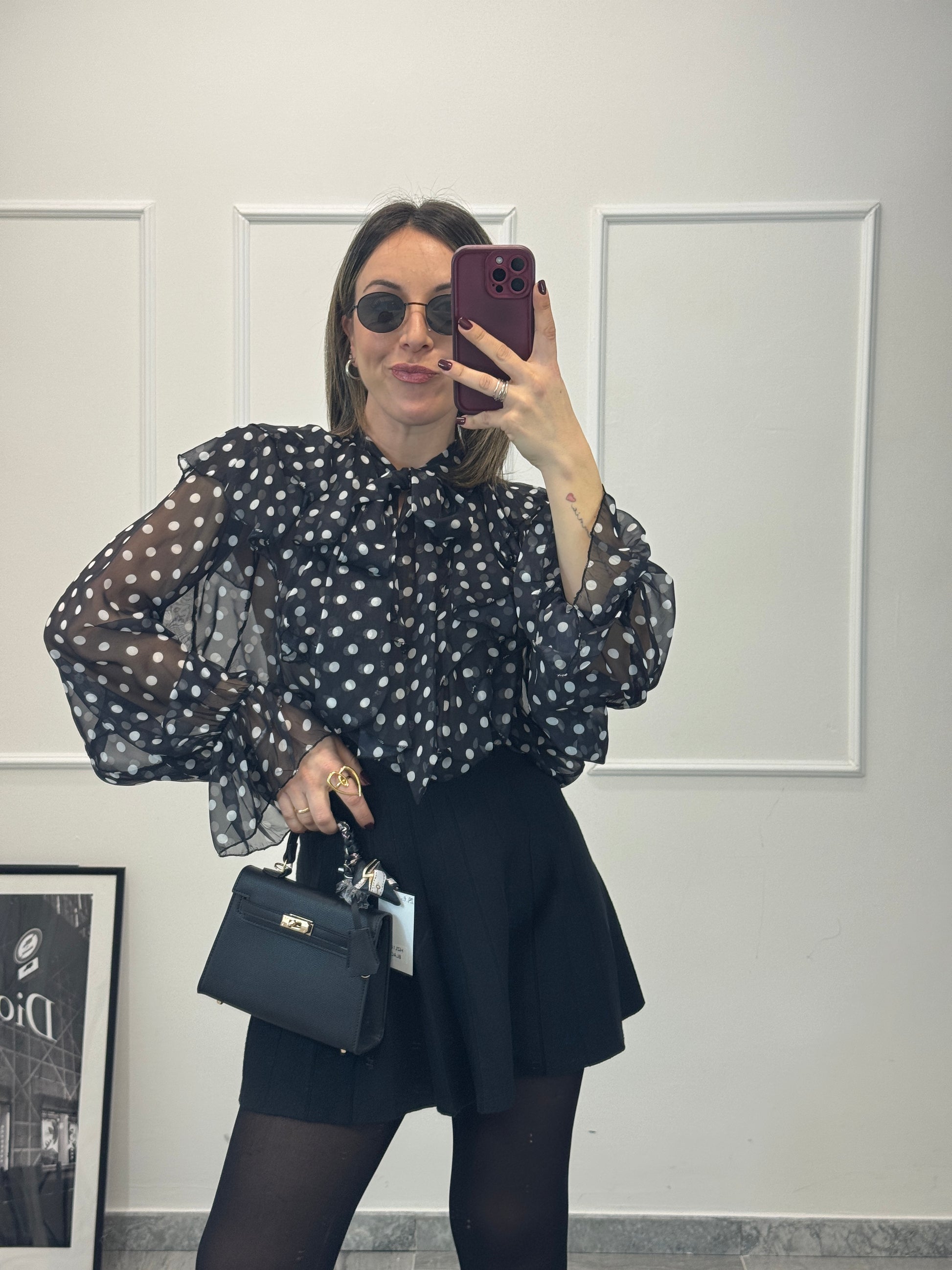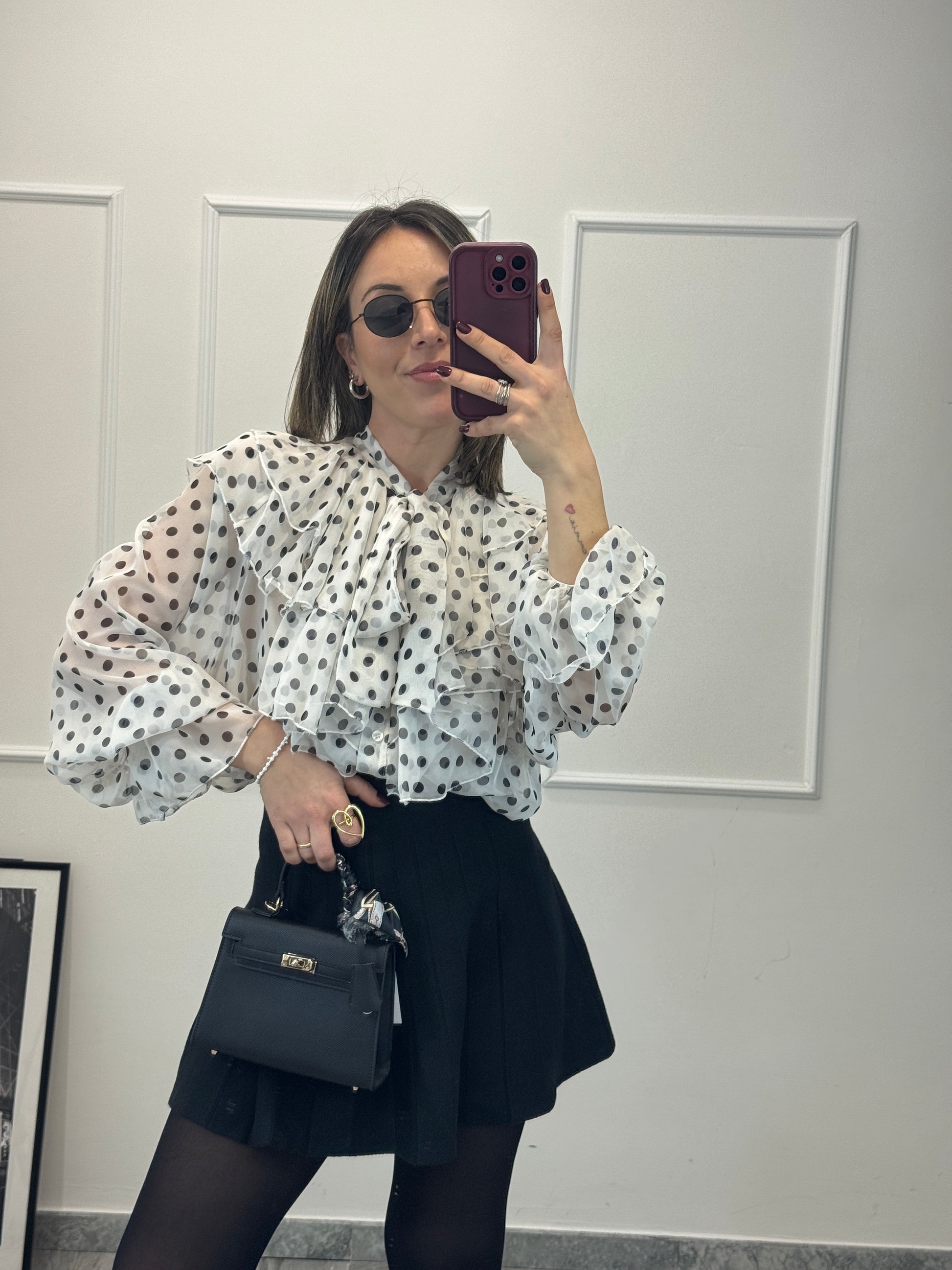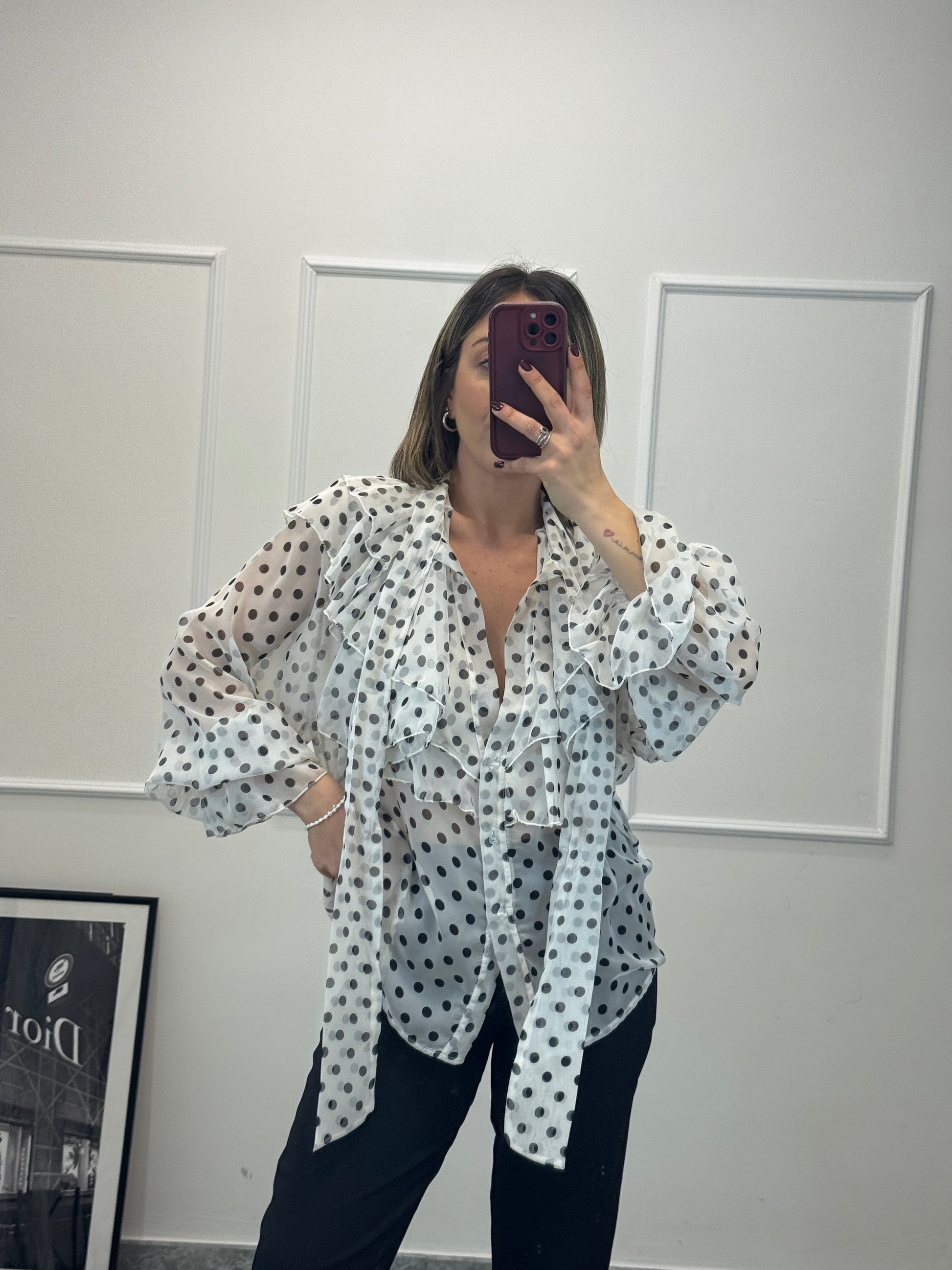 Camicia semitrasparente con bottoni. Fiocco sul collo e rouge veste fino alla L